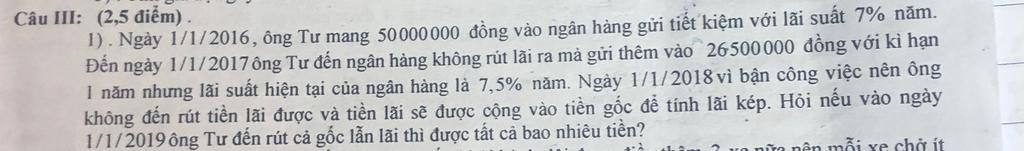 Bài 1: Ngày 1/1/2016, ông Tư mang 50 000 000 đồng vào ngân hàng gửi tiết kiệm với lãi suất 7% năm. Đến ngày 1/1/2017, ông Tư đến ngân hàng không rút lãi ra mà gửi thêm vào 26 500 000 đồng với kì hạn 1 năm nhưng lãi suất hiện tại của ngân hàng là 7,5% năm. Ngày 1/1/2018 vì bận công việc nên ông không đến rút tiền được và tiền lãi sẽ được cộng vào tiền gốc để tính lãi kép. Hỏi nếu vào ngày 1/1/2019, ông Tư đến rút cả gốc lẫn lãi thì được tất cả bao nhiêu tiền?