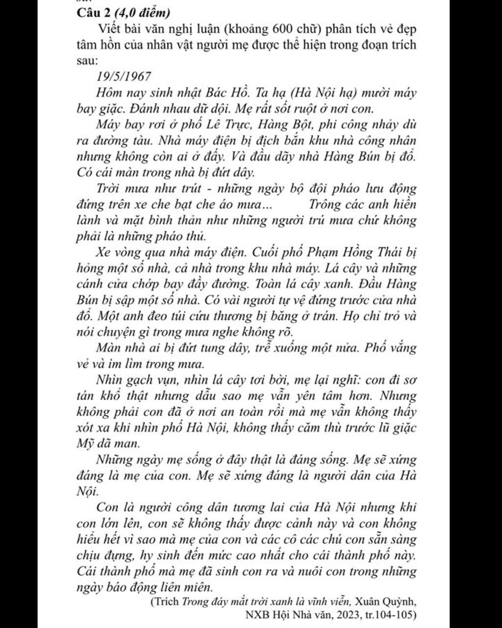 Giữa những ngày chiến tranh ác liệt, khi tiếng bom đạn rền vang khắp phố phường Hà Nội, vẫn có những trái tim âm thầm nuôi dưỡng tình yêu thương và niềm tin mãnh liệt vào cuộc sống. Văn chương, bằng những trang viết chân thành đã khắc họa vẻ đẹp sáng ngời của con người Việt Nam trong khói lửa chiến tranh. Đoạn trích trong Trong đáy mắt trời xanh là vĩnh viễn của Xuân Quỳnh đã để lại một dấu ấn đặc biệt khi tái hiện vẻ đẹp tâm hồn của người mẹ - một người phụ nữ dịu dàng, kiên cường, vừa cháy bỏng yêu thương con, vừa chan chứa lòng yêu nước thiết tha.