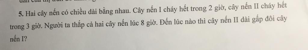 5. Hai cây nến có chiều dài bằng nhau. Cây nến I cháy hết trong 2 giờ, cây nến II cháy hết