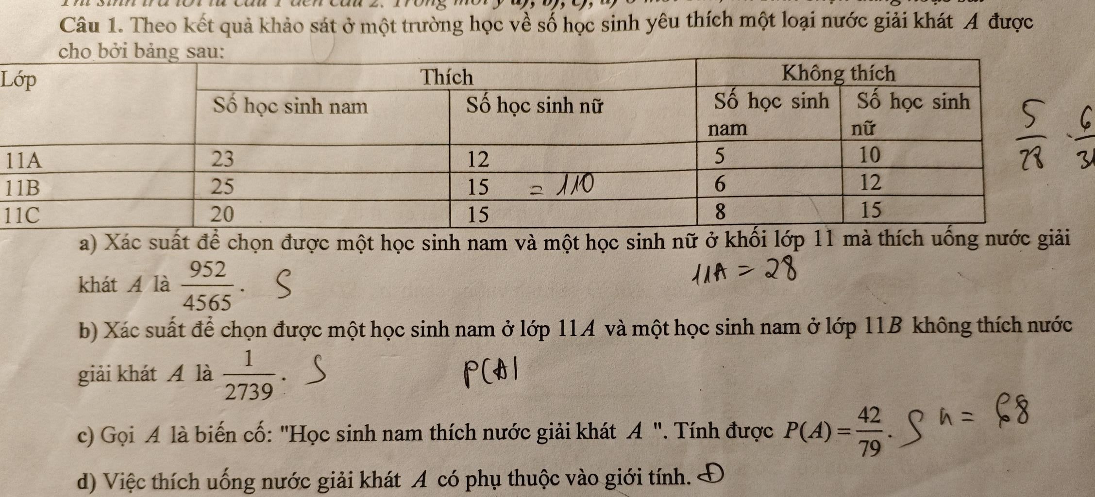 b.Xác suất để chọn được một học sinh nam ở 11A và một học sinh nam ở 11B không thích nước giải khát A là: