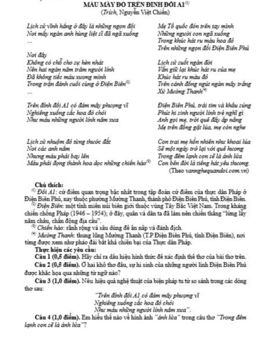 Câu 2 (0,5 điểm): Hai khổ thơ đầu của bài thơ đã tái hiện sự hi sinh của những người lính Điện Biên Phủ được khắc họa qua những từ ngữ nào?