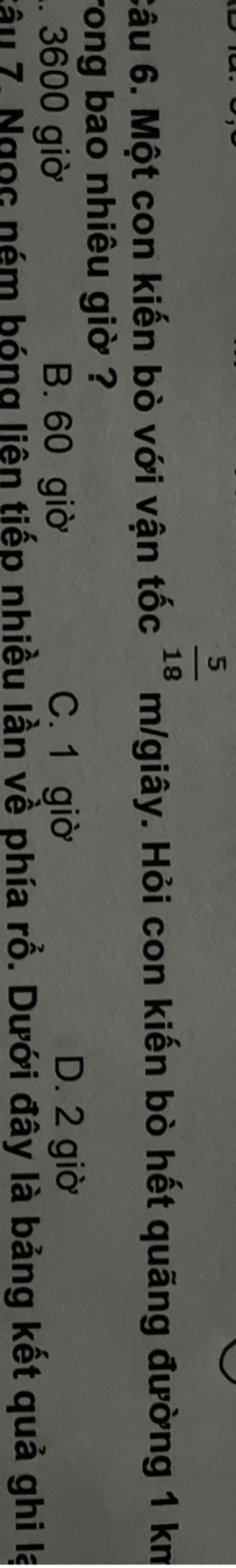 Một con kiến bò với vận tốc 5/18 m/s.Hỏi con kiến bò hết quãng đường 1km trong bao nhiêu giờ?