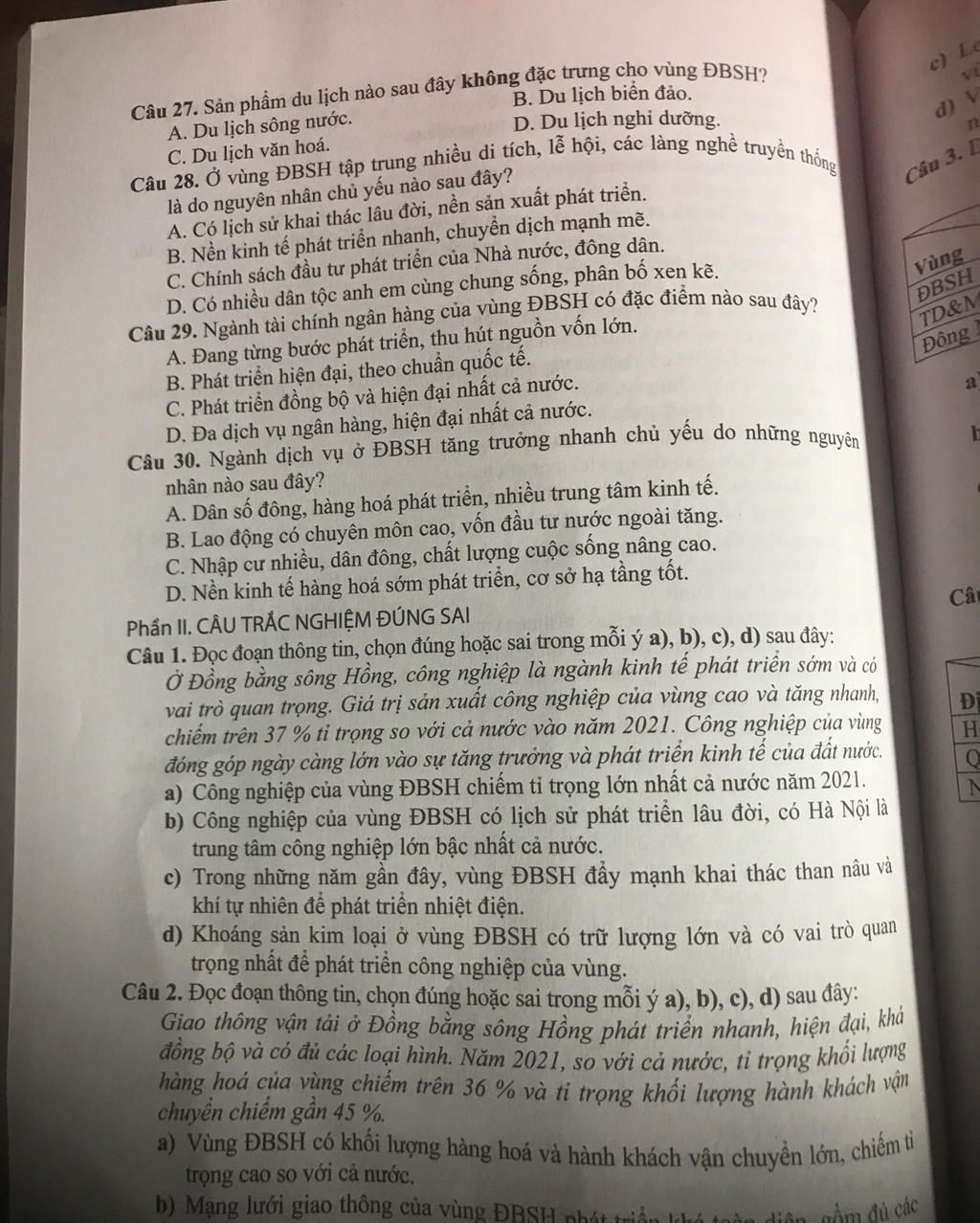 27: A. Du lịch sông nước → Không đặc trưng cho ĐBSH, vì loại hình này phổ biến ở ĐBSCL.