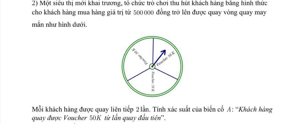 2) Một siêu thị mới khai trương, tổ chức trò chơi thu hút khách hàng bằng hình thức cho khách hàng mua hàng giá trị từ 500 000 đồng trở lên được quay vòng quay may mắn như hình dưới.