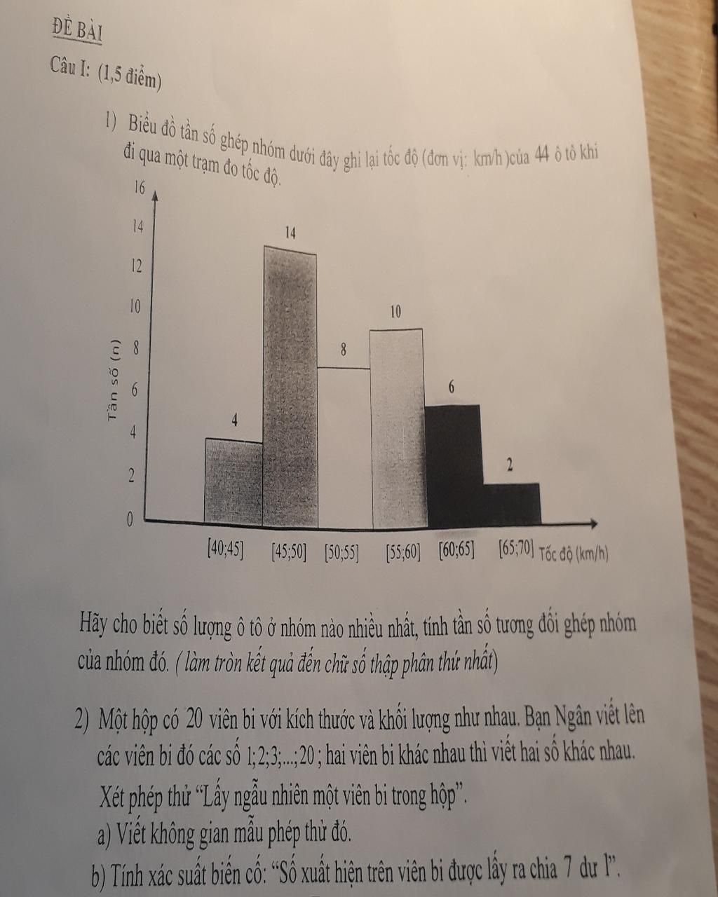 `1)` : Số lượng ô tô ở nhóm [ 45;50) là nhiều nhất . Tần số tương đối ghép nhóm của nhóm đó là : `14/44` `.` `100` ≈ `31,8%`