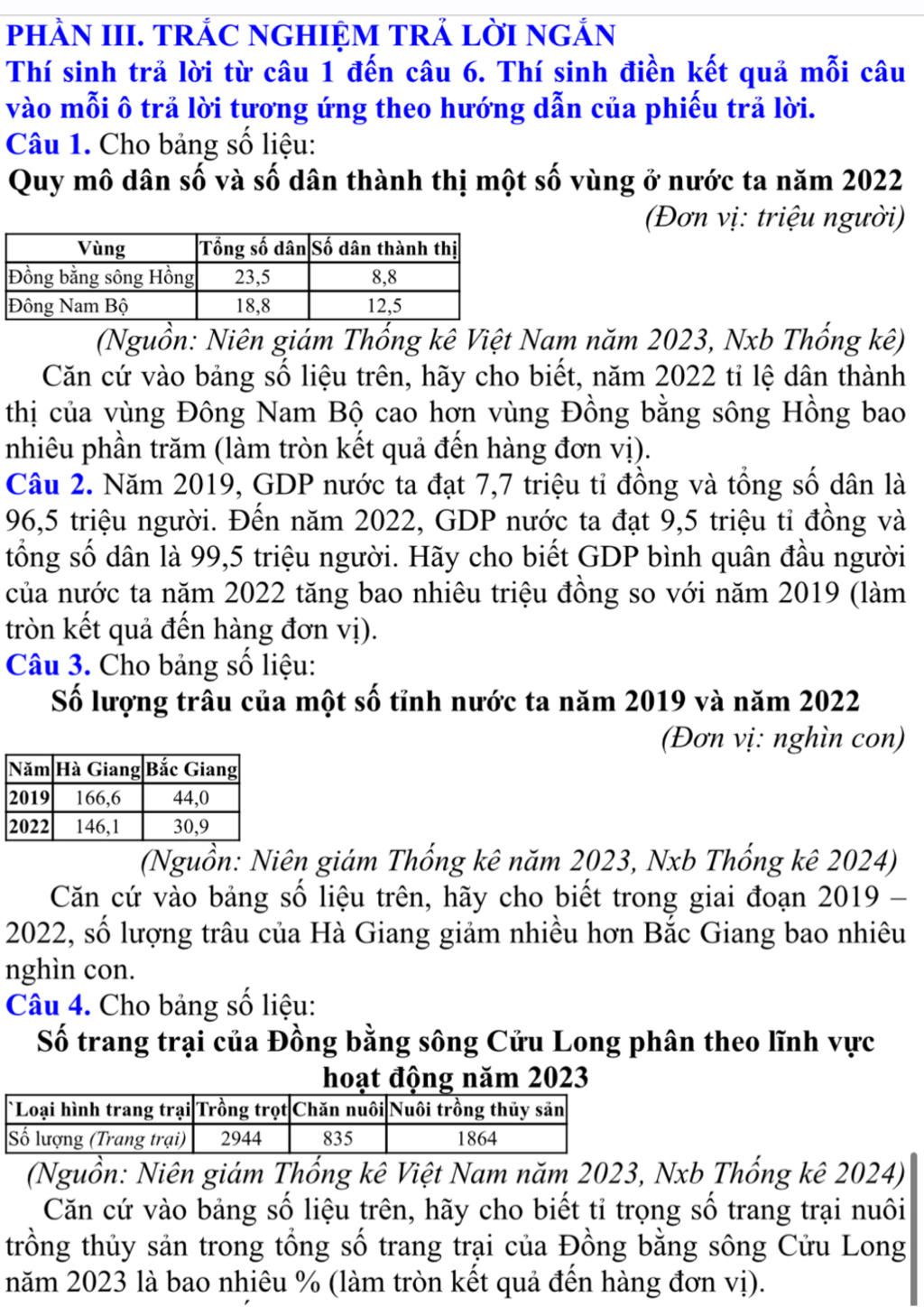 Câu `bb1`:$\\$ CT: Tỉ trọng `(%)=` Cá thể `:` Tổng thể `xx100`$\\$ Tỉ lệ dân thành thị của vùng Đông Nam Bộ so với vùng Đồng bằng Sông Hồng cao hơn:$\\$ $\Bigg(\dfrac{12,5}{18,2}\times100\Bigg)-\Bigg(\dfrac{8,8}{23,5}\times100\Bigg)\approx29(\%)$$\\$ Câu `bb2`:$\\$ CT: GDP bình quân đầu người`=` GDP`:` Số dân.$\\$ GDP bình quân đầu người của nước ta năm `2022` so với năm `2019` tăng:$\\$ $\dfrac{9,5\times10^3}{99,5}-\dfrac{7,7\times10^3}{96,5}\approx16($triệu đồng$)$$\\$Câu `bb3`:$\\$ Số lượng trâu của Hà Giang so với Bắc Giang giai đoạn $\rm 2019-2022$ giảm:$\\$ $(166,6-44,0)-(146,1-30,9)\approx7,4($nghìn con$)$$\\$ Câu `bb4`:$\\$ CT: Tỉ trọng `(%)=` Cá thể `:` Tổng thể `xx100`$\\$ Tỉ trọng số trang trại nuôi trồng thuỷ sản trong tổng số trang trại của Đồng bằng sông Cửu Long năm `2023`:$\\$ $\dfrac{1\,864}{2\,944+835+1\,864}\times100\approx33(\%)$
