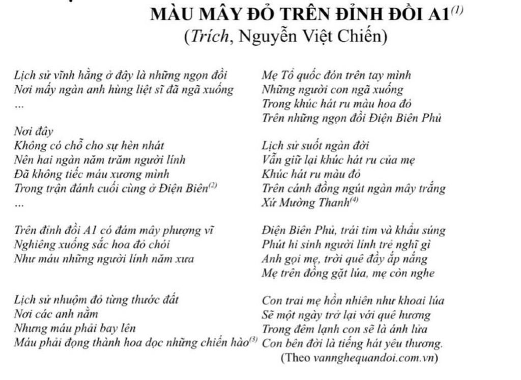 Trong nền thơ ca kháng chiến Việt Nam, có rất nhiều tác phẩm đã khắc họa sinh động hình ảnh người lính - những con người đã cống hiến cả tuổi xuân và mạng sống vì nền độc lập dân tộc. Một trong những tác phẩm tiêu biểu là bài thơ “Màu mây đỏ trên đỉnh đồi A1” của nhà thơ Nguyễn Việt Chiến. Đoạn thơ trích dưới đây là một khúc tráng ca bi hùng, ca ngợi tinh thần chiến đấu quật cường và sự hy sinh cao cả của các chiến sĩ trong chiến dịch Điện Biên Phủ lịch sử.