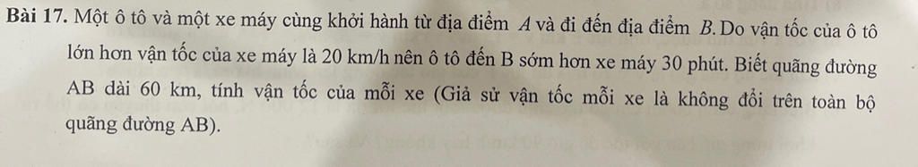 Thời gian xe máy đi trên quãng đường AB là: 60/x-20 (giờ)