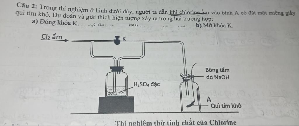 `-` khi đóng khóa K thì khí $\rm Cl_2$ ẩm sẽ được chuyển vào bình chứa $\rm H_2SO_4$ đặc. $\rm H_2SO_4$ đặc có tính háo nước nên khi khí $\rm Cl_2$ đi vào bình A sẽ là khí khô không làm thay đổi màu quỳ tím.