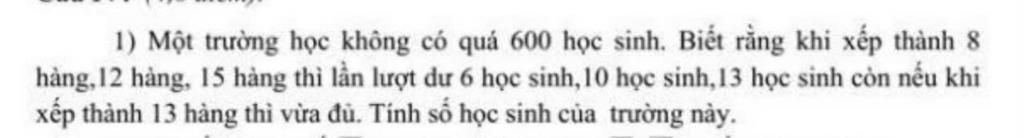 Theo bài ra , vì xếp thành `8` hàng `, 12` hàng và `15` hàng thì thừa lần lượt `6` , `10` , `13` học sinh nên nếu thêm `2` bạn thì số học sinh sẽ xếp được `8` hàng `, 12` hàng `, 15` hàng