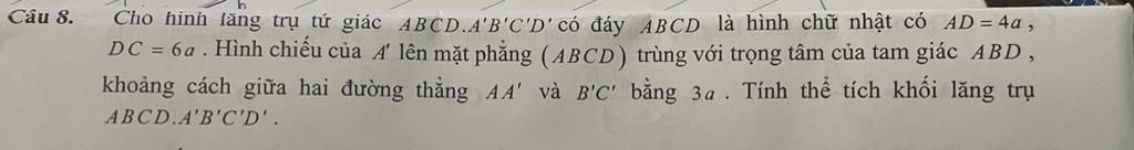 Cho hình lăng trụ tứ giác ABCD.A'B'C'D' có đáy ABCD là hình chữ nhật có AD=4a,