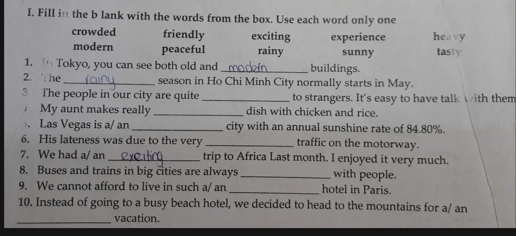 I. Fill in the blank with the words from the box. Use each word only one