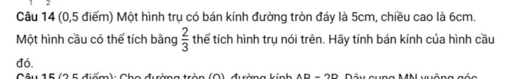 `V_(cầu) = 2/3 V_(trụ)= 150pi* 2/3 = 100pi(cm^3)`