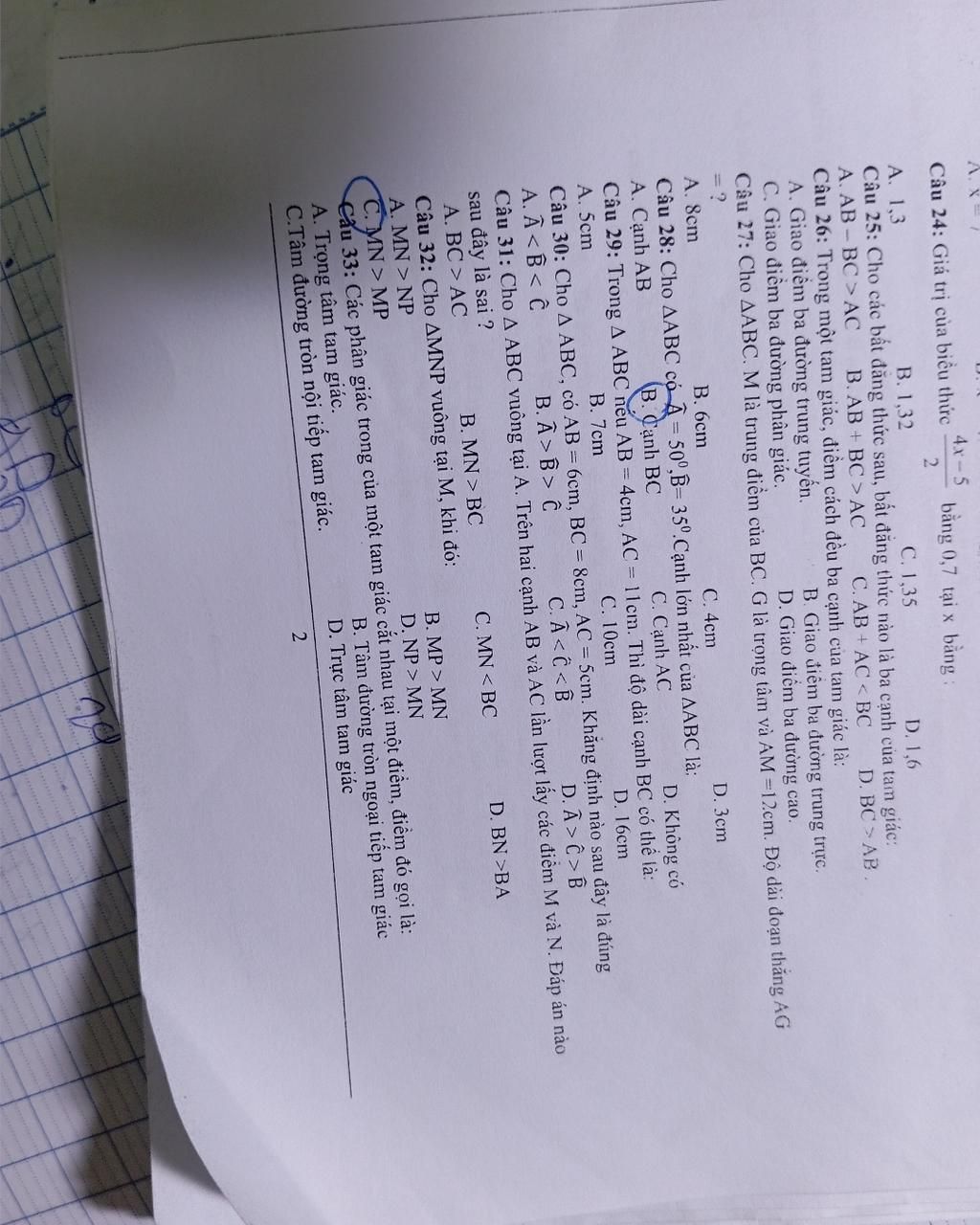 Câu 25: Cho các bất đẳng thức sau, bất đẳng thức nào là ba cạnh của tam giác: