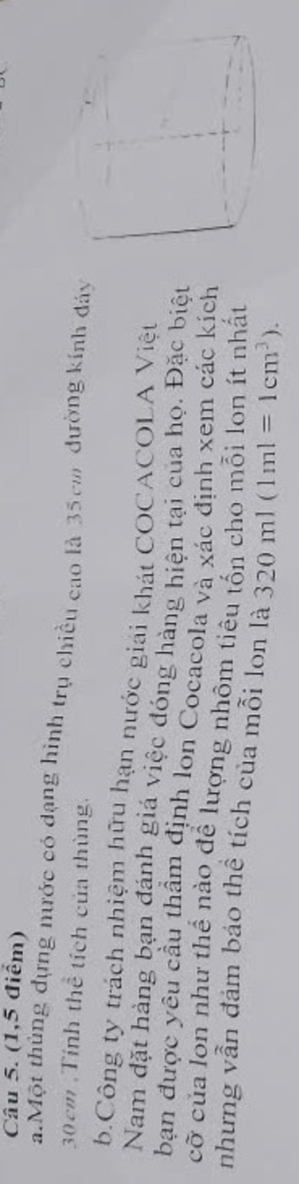 a.Một thủng dụng nước có dạng hình trụ chiều cao là 35cm, đường kính đáy