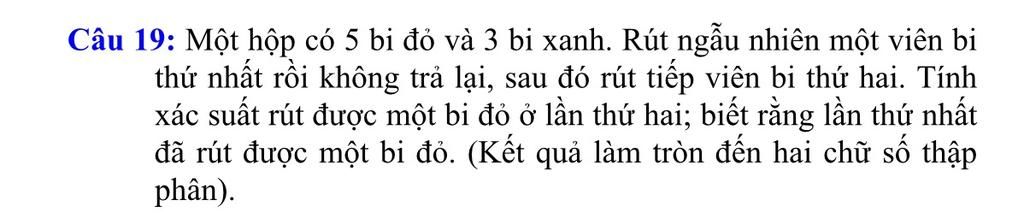 Câu 19: Một hộp có 5 bị đỏ và 3 bi xanh. Rút ngẫu nhiên một viên bi