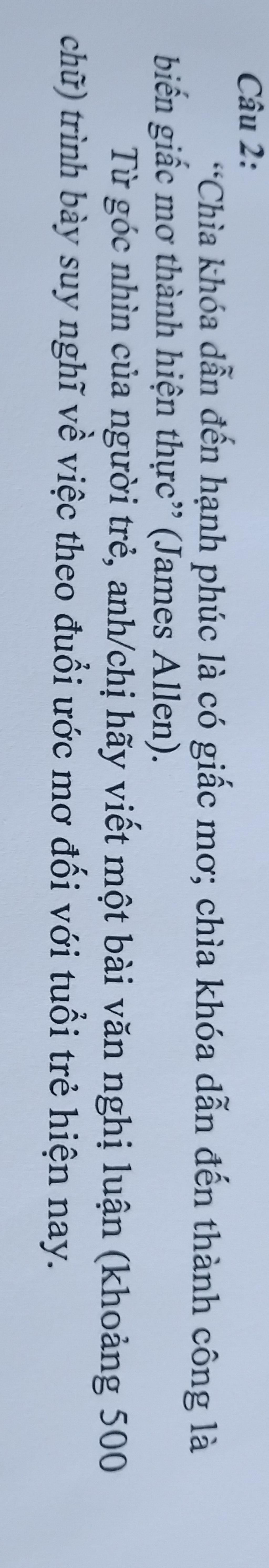 `=>` James Allen từng nói: “Chìa khóa dẫn đến hạnh phúc là có giấc mơ; chìa khóa dẫn đến thành công là biến giấc mơ thành hiện thực.” Câu nói không chỉ là một lời khuyên mà còn là kim chỉ nam cho tuổi trẻ, độ tuổi đẹp nhất của cuộc đời, nơi ước mơ chớm nở và khát vọng vươn lên mạnh mẽ nhất.