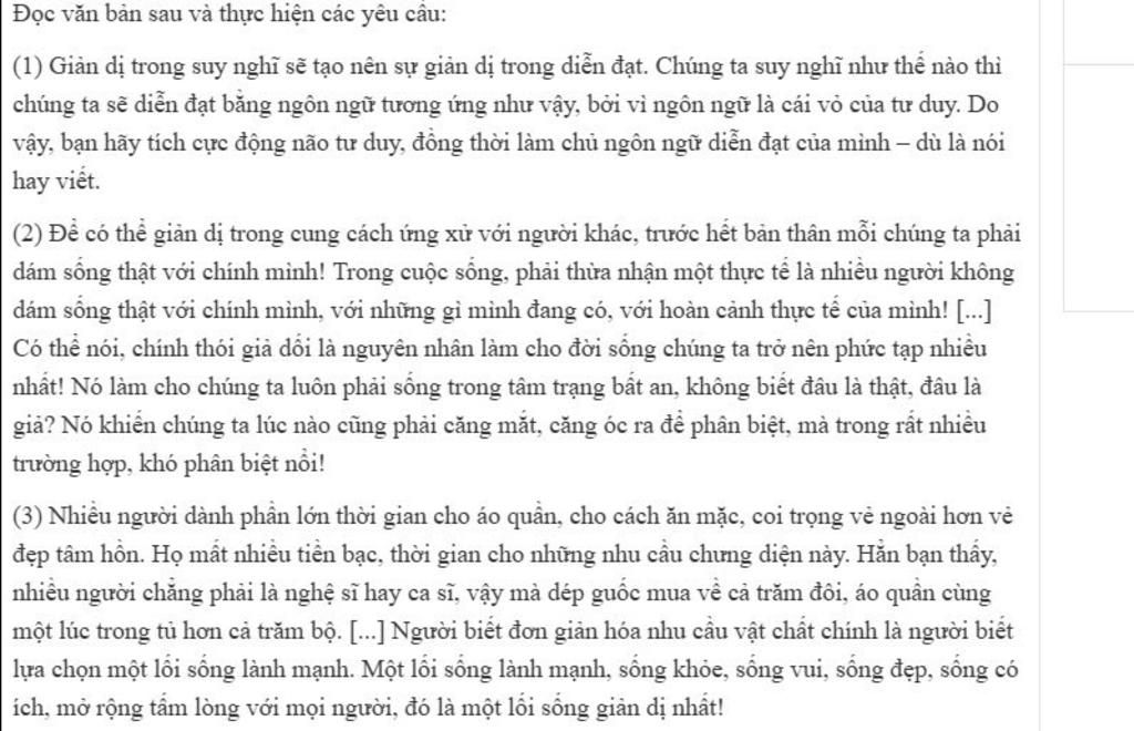 4. Trong cuộc sống, giữa ba việc: giản dị trong suy nghĩ, giản dị trong cách ứng xử và giản dị trong nhu cầu về vật chất, em quan tâm đến việc nào nhất? Vì sao? ( trả lời trong khoảng 7-10 dòng )