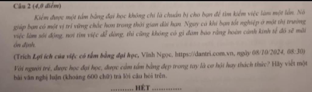 Trong xã hội hiện đại , tấm bằng đại học từ lâu đã được xem là biểu tượng của tri thức , là chìa khóa mở cánh cửa tương lai đầy hứa hẹn . Nó không chỉ là sự ghi nhận những nỗ lực học tập mà còn được kỳ vọng sẽ mang lại một vị thế vững chắc trong sự nghiệp . Ý kiến từ trang Dân trí đã khẳng định giá trị lâu dài của tấm bằng đại học : " Kiếm được một tấm bằng đại học không chỉ là chuẩn bị cho bạn để tìm kiếm việc làm một lần . Nó giúp bạn có một vị trí vững chắc hơn trong thời gian dài hạn . Ngay cả khi bạn tốt nghiệp ở một thị trường việc làm sôi động , nơi tìm việc dễ dàng , thì cũng không có gì đảm bảo rằng hoàn cảnh kinh tế đó sẽ mãi ổn định . " Tuy nhiên , trong bối cảnh thị trường lao động không ngừng biến động và những yêu cầu ngày càng khắt khe , liệu việc được học đại học và sở hữu tấm bằng đẹp trong tay thực sự là cơ hội rộng mở hay còn ẩn chứa những thách thức không nhỏ đối với người trẻ ?