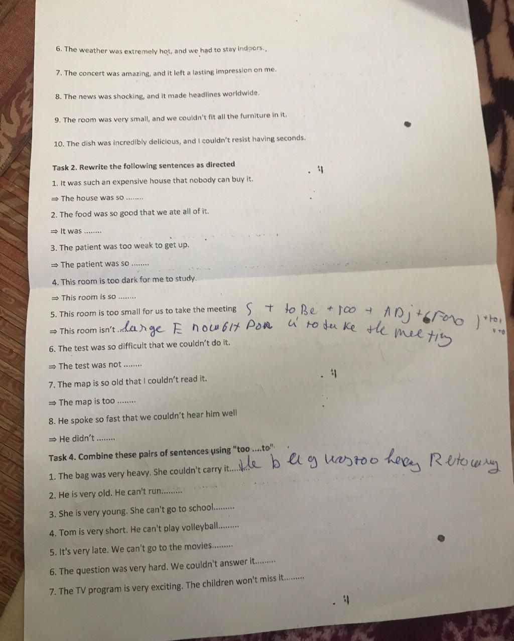 1. The bag was too heavy for her to carry.