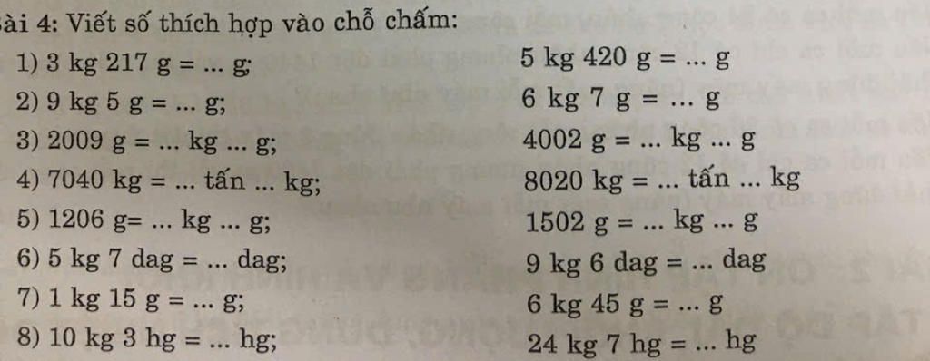 4)7040kg=7tấn 4kg 8020kg=8 tấn 20kg