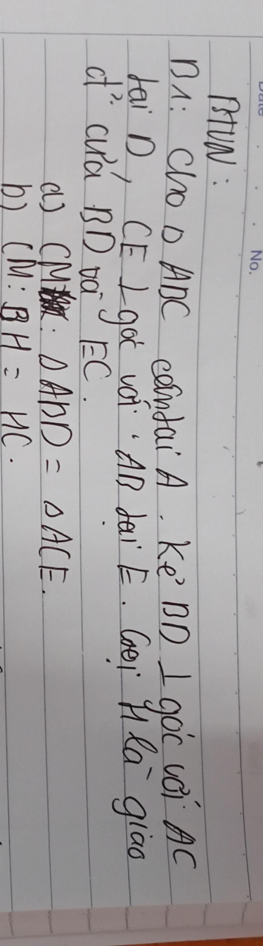 BD⊥ACBD \perp ACBD⊥AC, CE⊥ABCE \perp ABCE⊥AB nên 2 đường cao cắt nhau tại HHH