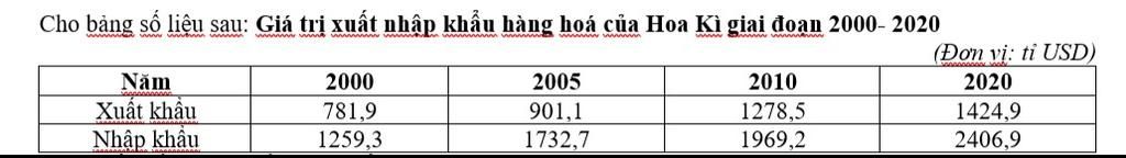 Tính tỉ trọng giá trị xuất, nhập khẩu hàng hóa của Hoa Kì giai đoạn 2000- 2020