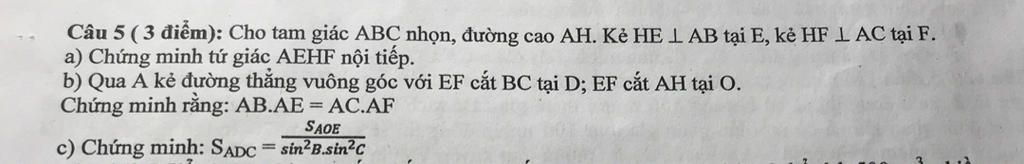Câu 5 ( 3 điểm): Cho tam giác ABC nhọn, đường cao AH. Kẻ HE _ AB tại E, kẻ HF L AC tại F.