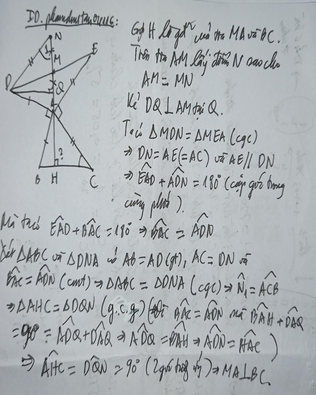 Bài 3: Cho ABC có A<90 độ, vẽ ra phía ngoài tam giác đó hai đoạn thẳng AD vuông góc và bằng AB, AE vuông góc và bằng AC, Gọi M là trung điểm của DE, kẻ MA, CMR: MA vuông góc với BC