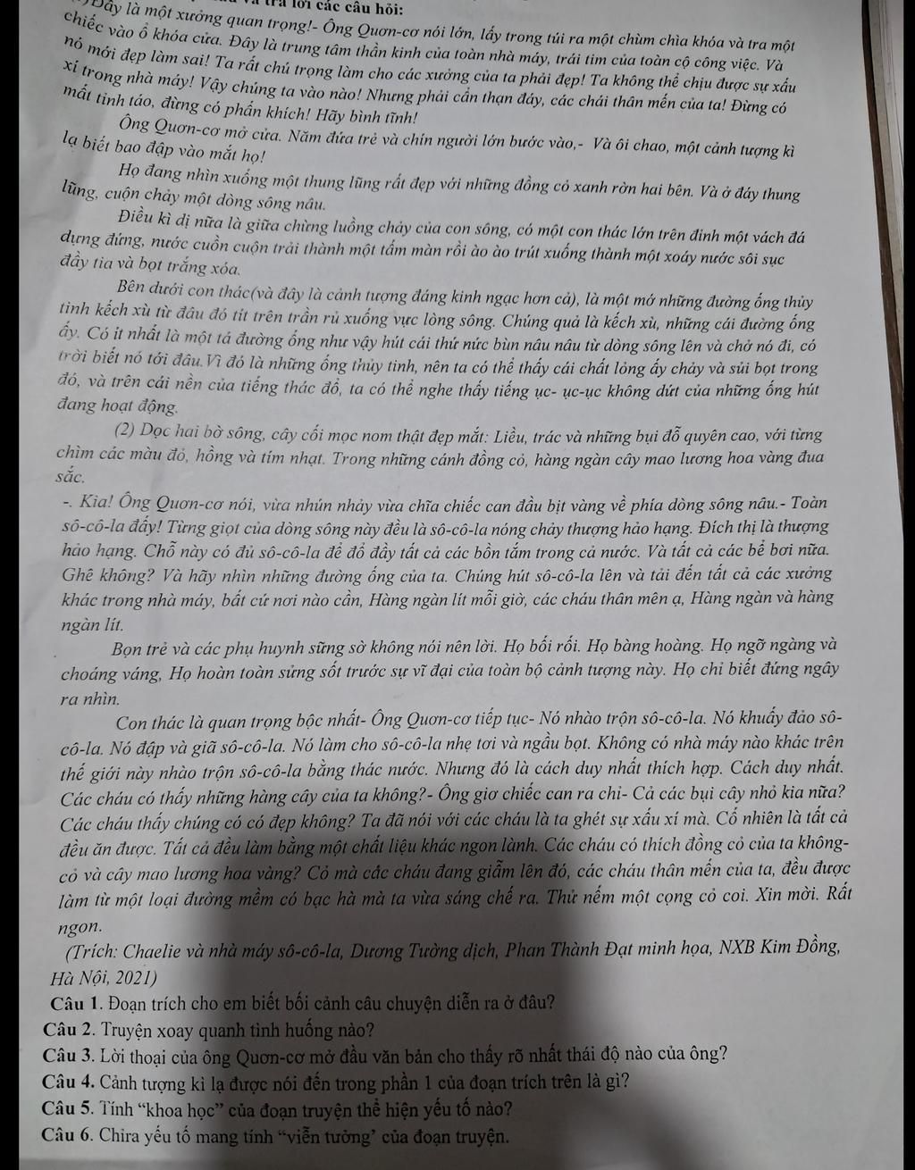 Câu 5. Yếu tố “khoa học” được thể hiện qua mô tả hệ thống máy móc, đường ống và thủy lực: việc dùng áp lực nước để hút và chuyển sô‑cô‑la, các ống dẫn ghép nối từ thác vào tận từng bồn chứa, âm thanh “ục ục ực ực” của máy móc… cho thấy một công nghệ chế biến hiện đại, hợp lý về mặt kỹ thuật.