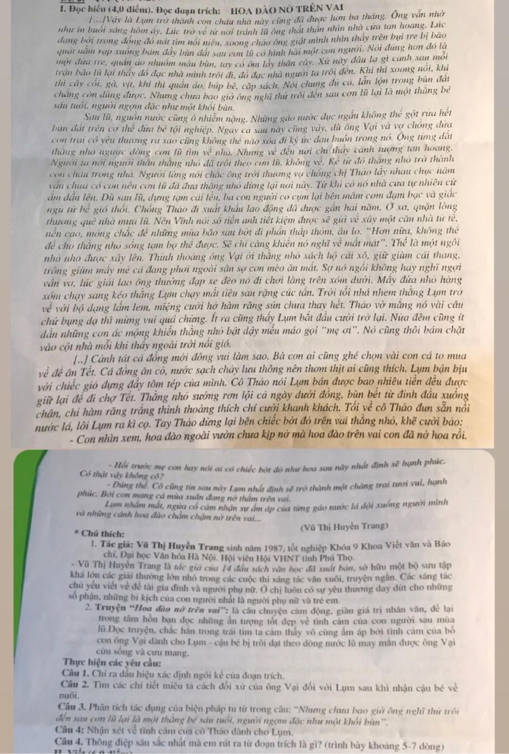 I. Đọc hiểu (4,0 điểm). Đọc đoạn trích: HOA ĐÀO NỞ TRÊN VAI