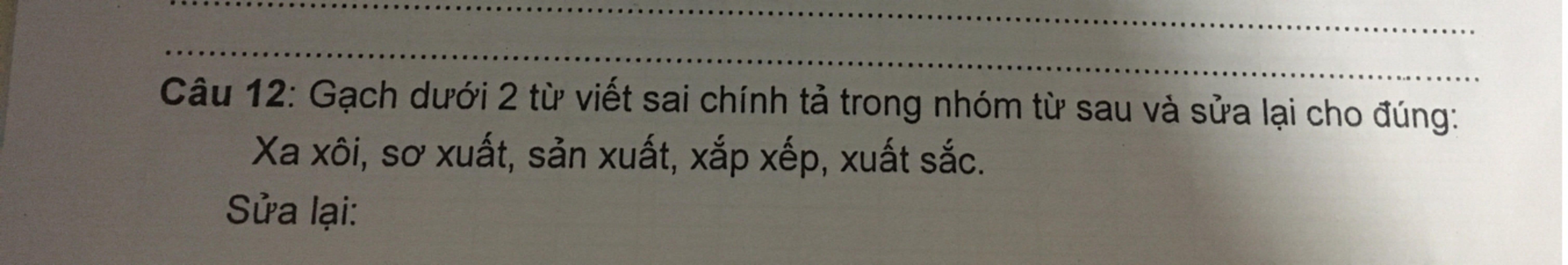 Câu 12: Gạch dưới 2 từ viết sai chính tả trong nhóm từ sau và sửa lại cho đúng:Xa xôi, sơ xuất, sản xuất, xắp xếp, xuất sắc.Sửa lại: - sơ xuất → sơ suất