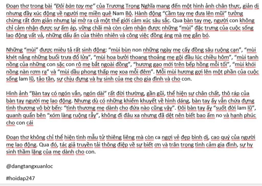 Viết bài văn phân tích đoạn thơ sau trong bài thơ "Đôi bàn tay mẹ" của nhà thơ Trờng Trọng Nghĩa