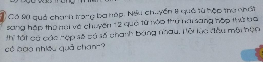 Có 90 quả chanh trong ba hộp nếu truyền chín quả từ hộp thứ nhất sang hộp thứ hai chuyển 12 quả từ hồ thứ hai trong hộp thứ ba thì tất cả số hộp sẽ có số chân bằng nhau hỏi lúc đầu mỗi hộp có bao nhiêu quả chanh