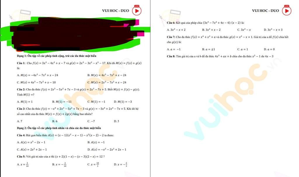 Câu 7: Cho đa thức f(x) = x + xả + a và đa thức g(x) = x2 – x + 1. Giá trị của a để f(x) chia hết