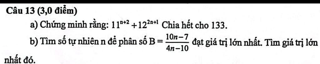 Suy ra $133 .$ $11^{n}$ $+$ $($$144^{n}$ $–$ $11^{n}$ $)$ $. 12$ hay $11^{n+2}$ $+$ $12^{2n+1}$ chia hết cho $133.$