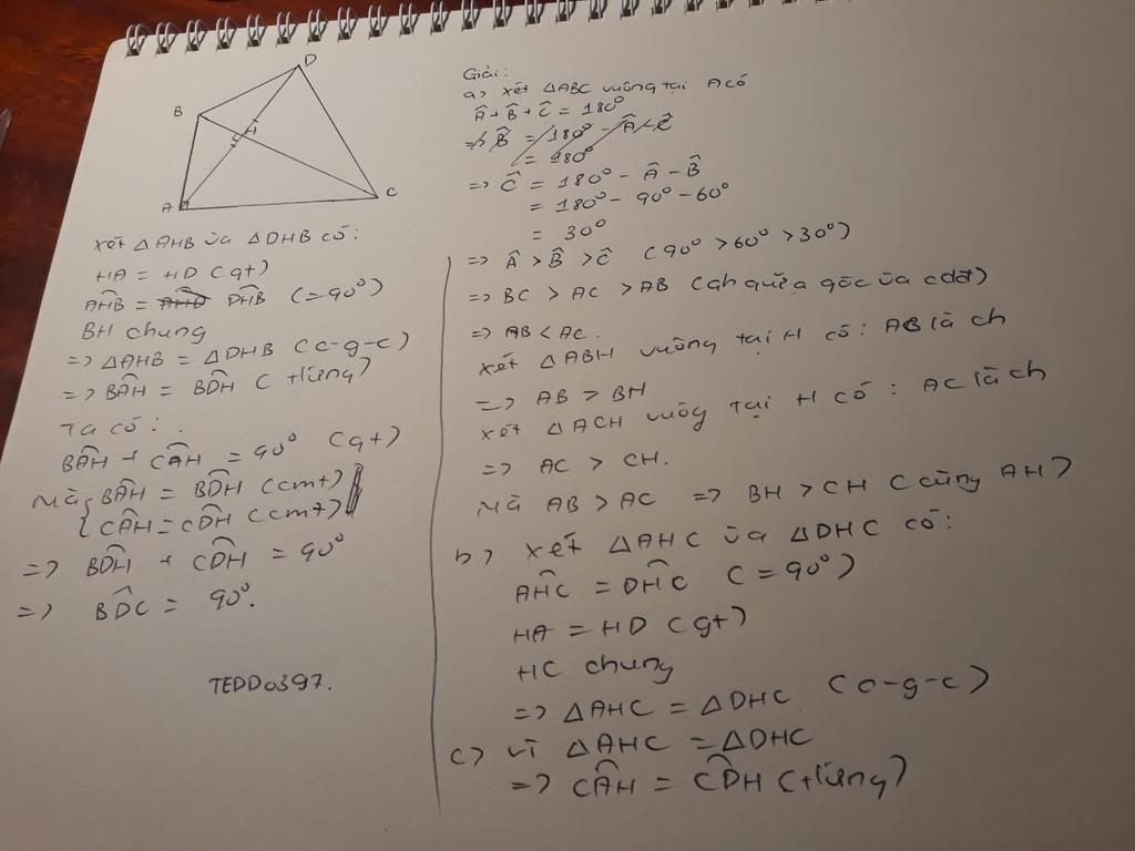 b,Lấy điểm D thuộc tia đối của tia HA sao cho HD=HA.Chứng minh rằng hai tam giác AHC avf DHC bằng nhau
