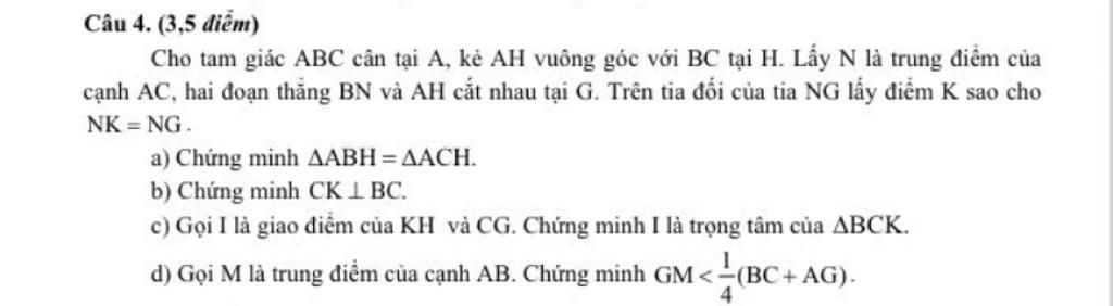 Cho tam giác ABC cân tại A, kẻ AH vuông góc với BC tại H. Lấy N là trung điểm của