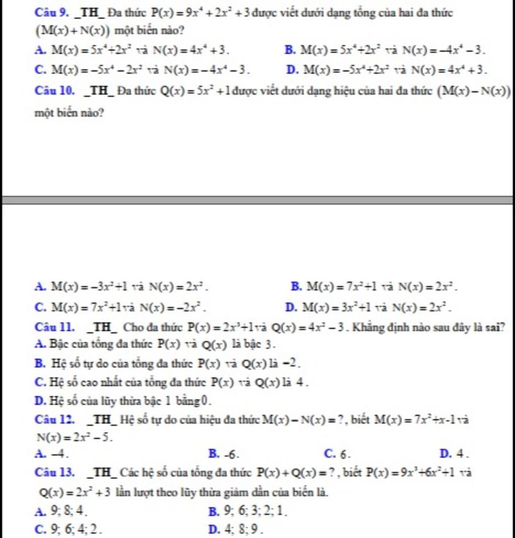 Câu 10. _TH_ Đa thức Q(x)=5r’+1 được viết dưới dạng hiệu của hai ...