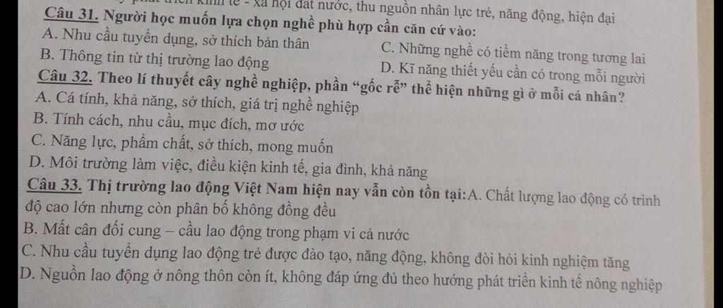 Câu 31. Người học muốn lựa chọn nghề phù hợp cần căn cứ vào: