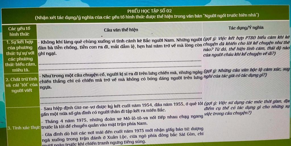 (Nhận xét tác dụng/ý nghĩa của các yếu tố hình thức được thể hiện trong văn bản "Người ngồi trước hiên nhà )