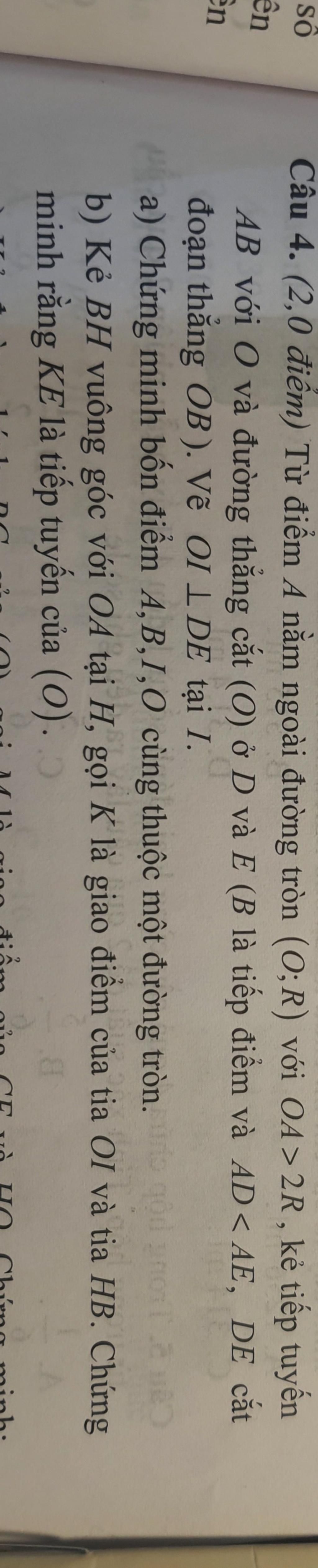 Ta có`:` $\triangle$`AIO` vuông tại B `(hat(AIO) = 90^o` do `OI \bot AE` $(gt))$