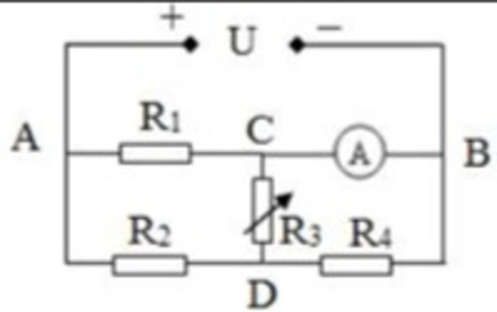 Cho mạch điện như hình vẽ, trong đó U = 24V R 1 = 12ôm R2 = 9Om R3 là biến trở; R4=6om. Ampe kế có điện trở không đáng kể.