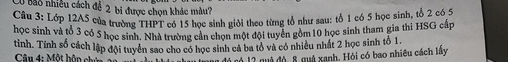 Câu 3: Lớp 12A5 của trường THPT có 15 học sinh giỏi theo từng tổ như sau: tổ 1 có 5 học sinh, tổ 2 có 5