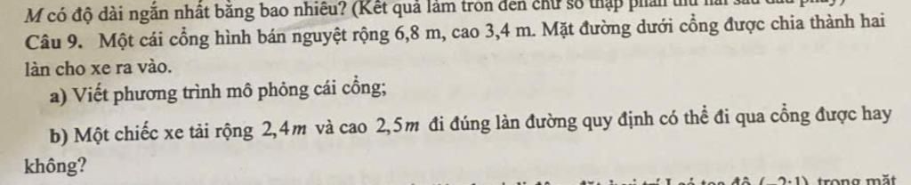 Câu 9. Một cái cổng hình bán nguyệt rộng 6,8 m, cao 3,4 m. Mặt đường dưới cổng được chia thành hai