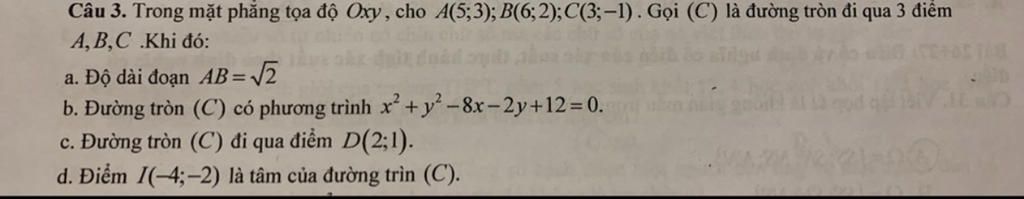 Câu 3. Trong mặt phẳng tọa độ Oxy, cho 4(5;3); B(6;2);C(3;−1) . Gọi (C) là đường tròn đi qua 3 điểm