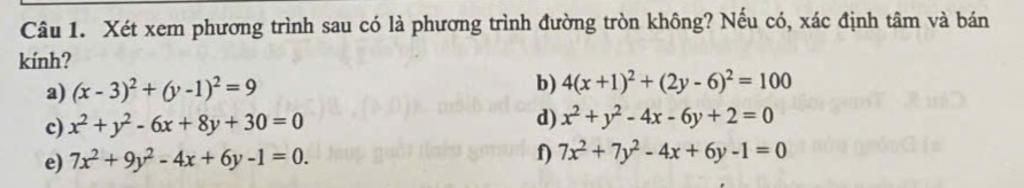 Câu 1. Xét xem phương trình sau có là phương trình đường tròn không? Nếu có, xác định tâm và bản