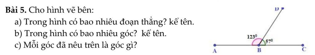 `b)` Trong hình bên có `3` góc: `hat(ABD); hat(ABC); hat(DBC)`