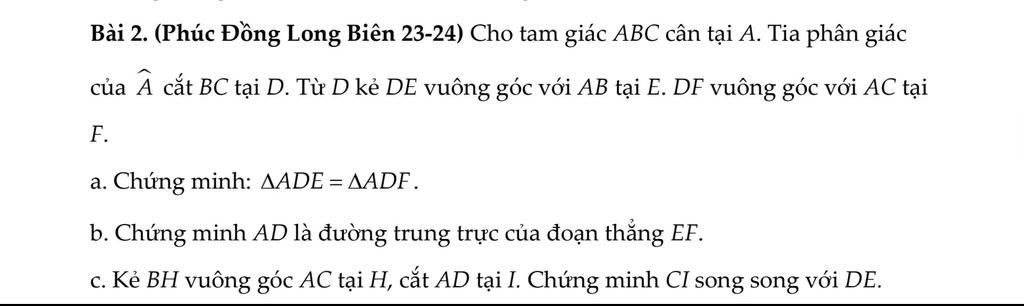 c.Vì $\Delta ABC$ cân tại $A, AD$ là phân giác $\hat A$