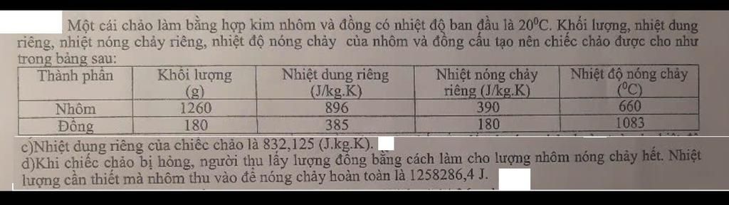 Nhiệt dung riêng của chảo trong điều kiện chưa bị nóng chảy một phần nào là:
